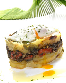 Sirve en la base de un molde una capa de patatas, (presiona un poco con ayuda de una cuchara), añade una capa de morcilla con los pimientos (presiona con la cuchara). Termina con otra capa de patatas, presiona y quita el molde. Coloca encima un huevo escalfado. Haz un corte en la yema y espolvorea con perejil picado.