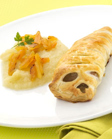 Estira y divide el hojaldre en 4 trozos. Haz unos cortes a la masa y envuelve cada solomillo.