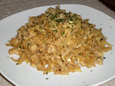 2º Freír la cebolla cortada en rodajas finas y estofarla en el aceite sin que tome color, despacio y tapada. Cuando esté frita añadir y rehogar el bacalao unos 10 m y añadir la mitad de las patatas paja.