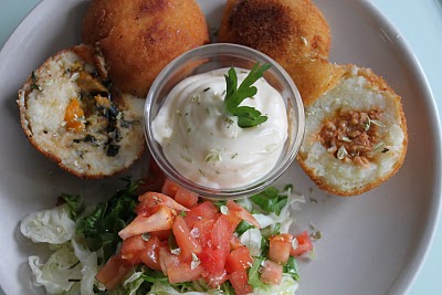 El cucharón de servir la sopa o una taza de café nos puede servir como medida para tomar las porciones del puré de patatas (así salen todas del mismo tamaño) y seguimos los siguientes pasos para el relleno.