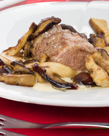 Sirve la sopa de patata en platos hondos y sazona. Coloca encima el carré de cordero asado y acompaña con los hongos salteados.