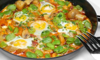 Sirve el guiso en cazuelitas o moldes individuales, añade las habas y casca 5 huevos de codorniz en cada ración. Introduce en el horno a 200º C. durante unos 8 minutos, hasta que los huevos se cuajen. Sirve en la misma cazuelita y acompaña con pan.