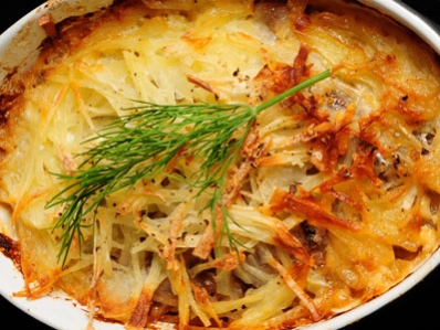 En una bandeja de horno, untada con mantequilla, colocamos una capa de patatas, sobre ésta la cebolla, una capa de anchoas y otra capa de patatas.