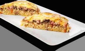 Corta la cebolla en juliana fina y ponla a pochar en una cazuela amplia y baja con un chorrito de aceite. Agrega el pimiento cortado en tiras y los dientes de ajo picados. Sofríe todo durante un par de minutos e incorpora el arroz. Vierte el caldo y condimenta con sal, pimienta y nuez moscada. Cocina durante 16 minutos aproximadamente. Deja reposar. Rehoga la carne de cerdo y de ternera en una sartén con un chorrito de aceite. Salpimienta, remueve y cocina durante un par de minutos. Corta el jamón en tiras pequeñas, añádelas en el último momento y retira la sartén del fuego. Coloca un cortapastas circular en un plato e introduce una porción de arroz. Aplasta un poco y coloca encima la carne y el jamón. Desmolda y cubre cada porción con tres lonchas de queso. Gratina en el horno y sirve.