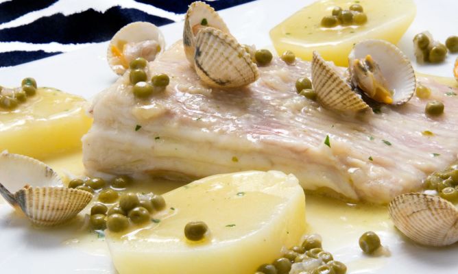 Para el caldo, pon a cocer las espinas de rape con la cabeza de merluza, el rabo de la cebolleta, unas ramas de perejil y una pizca de sal durante 15 minutos. Cuela y reserva. Pela las patatas, córtalas en rodajas de 1 cm. de grosor y ponlas a cocer en una cazuela con agua y una pizca de sal. Escurre y reserva. Para la salsa, pica los dientes de ajo y la cebolleta finamente y ponlos a pochar en una tartera. Vierte el vino y dale un hervor fuerte. Añade 2 cucharadas de harina y cocínalas. Vierte 2-3 cacitos del caldo reservado y mezcla todo bien. Incorpora los guisantes y los berberechos. Pon a punto de sal. Corta la raya en trozos. Sazona y mételos en la tartera. Espolvorea con perejil picado y cocina por los 2 lados durante 3 minutos a fuego suave. Añade las patatas y cocina todo durante 2 minutos más para que se mezclen los sabores. Sirve un trozo de raya por ración acompañada de unas patatas y unos berberechos y salsea.
