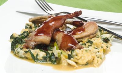 Para emplatar, coloca dos moldes cuadrados en la base de dos platos. Introduce el revuelto en los moldes y encima las codornices. Acompaña con la salsa de vino y desmolda.