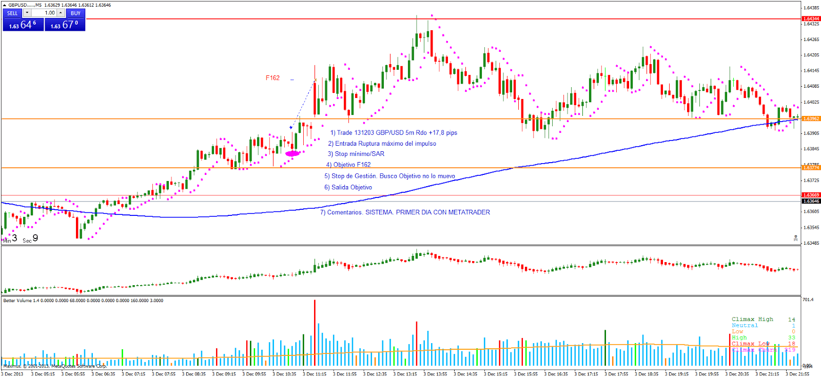 Trade 131203: Entrada ruptura máximo del impulso. Entro al mercado buscando el F162 de la subida, Stop en mínimo. Salida en objetivo con un Rdo de +17,8 pips.