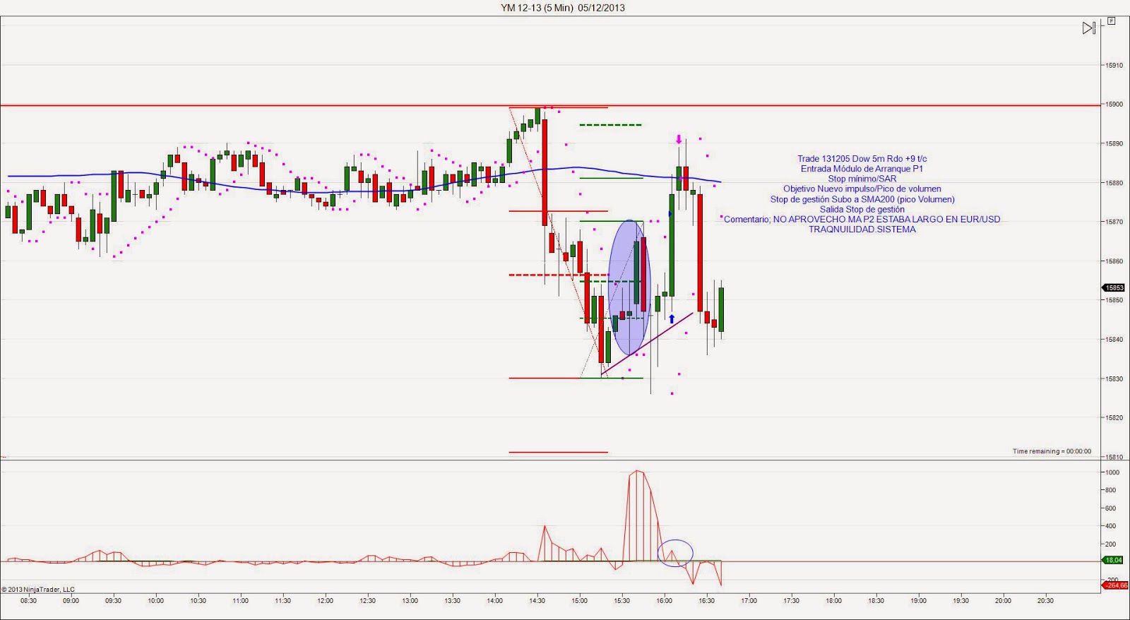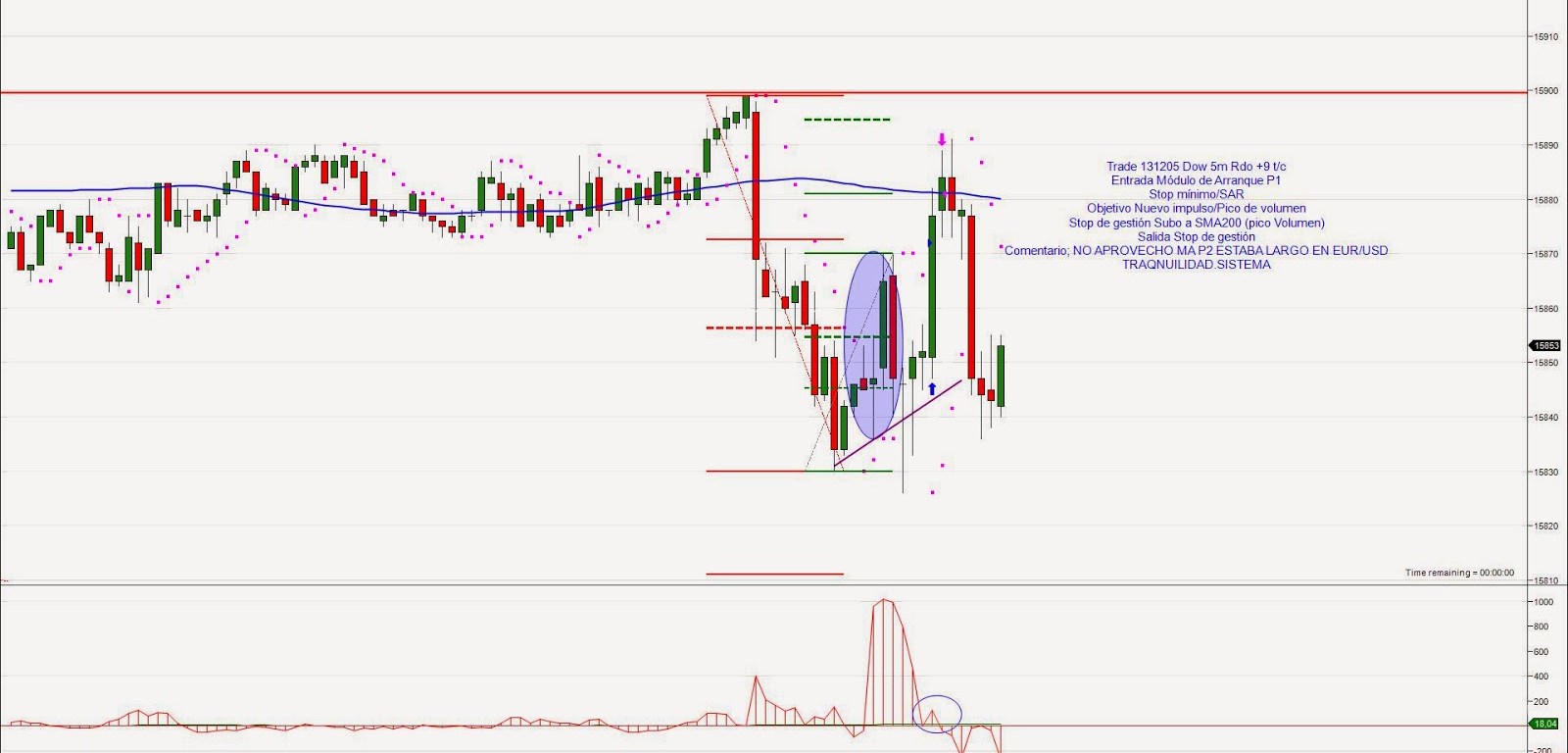 Trade 2: Entrada Módulo de Arranque P1. El precio hace una vela reversa en B que no aprovecho por estar metido en el rango del volumen de apertura. Entro en la ruptura del MA con objetivos F127/SMA200 y el origen del movimiento/F162 (resistencia). Pico de volumen en el primer objetivo donde subo el Stop de gestión y donde finalmente me saca del mercado con Rdo +9 t/c.