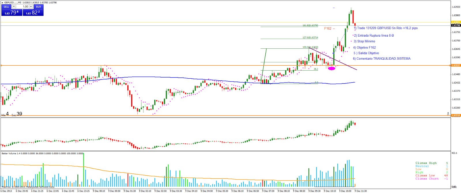 Trade 131209: Entrada ruptura línea 0-B. Corrección en ABC, entro al mercado en la ruptura de la 0-B con stop en mínimo y objetivo F162 del movimiento previo. Salida en objetivo con Rdo +16,2 pips.