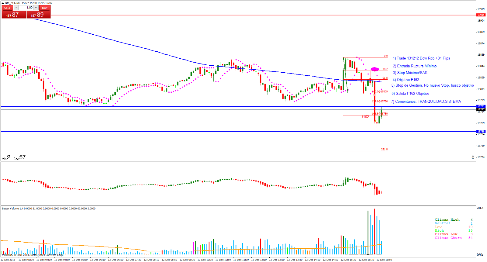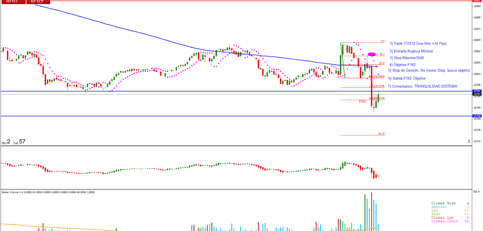Trade 3: Entrada Ruptura Mínimo del impulso. El precio hace un primer impulso corto y entro al mercado después de la corrección lineal buscando el F162 del segundo impulso. Salida en objetivo con Rdo +34 pips. Primer día con la plataforma Metatrader por lo que ajusto la Gestión Monetaria.