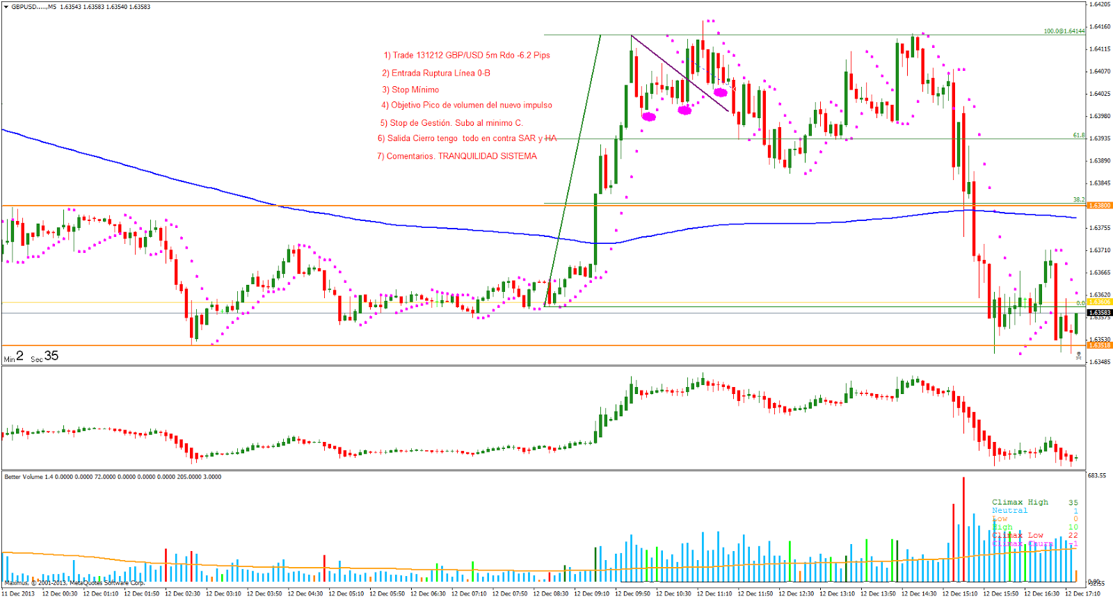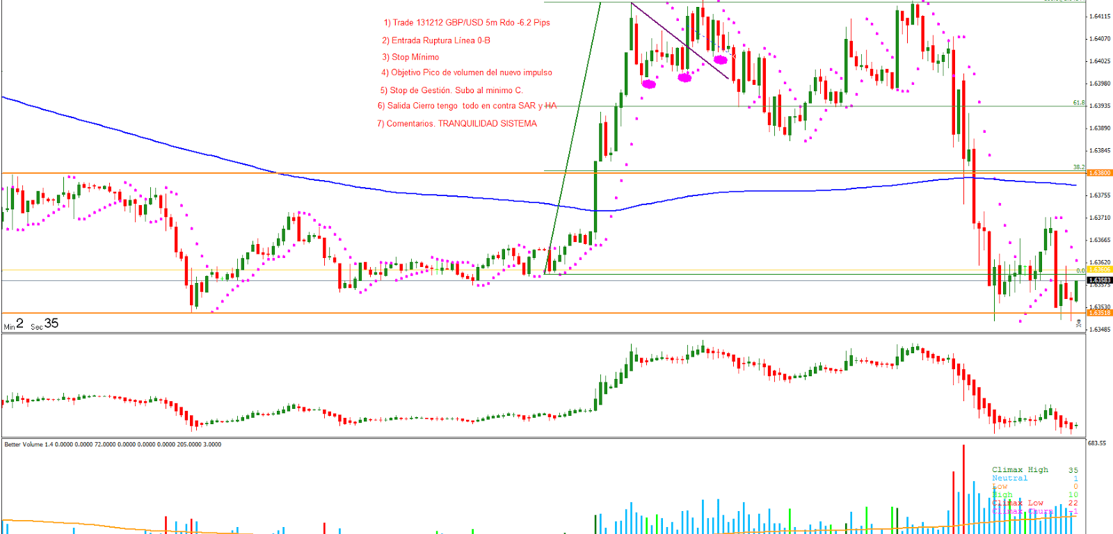Trade 2: Entrada ruptura línea 0-B. Corrección en ABC, entro al mercado en la ruptura de la 0-B con stop en mínimo y objetivo nuevo pico de volumen. El precio no hace nuevo impulso y gestiono el stop siguiendo el Parabolic a los nuevos mínimos. Cierro la posición porque tengo todo en contra con Rdo -6,2 pips.
