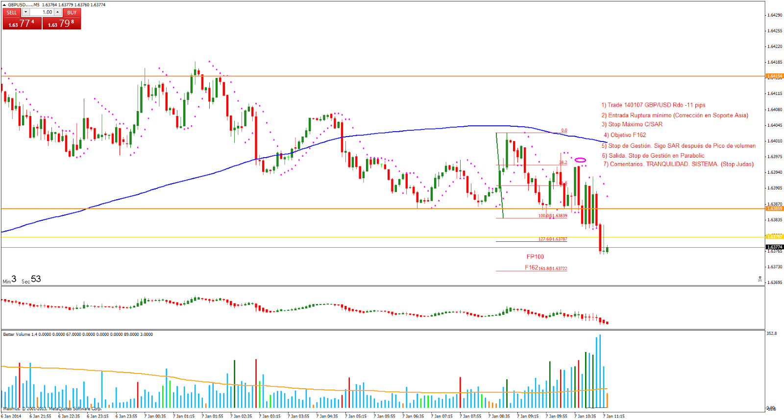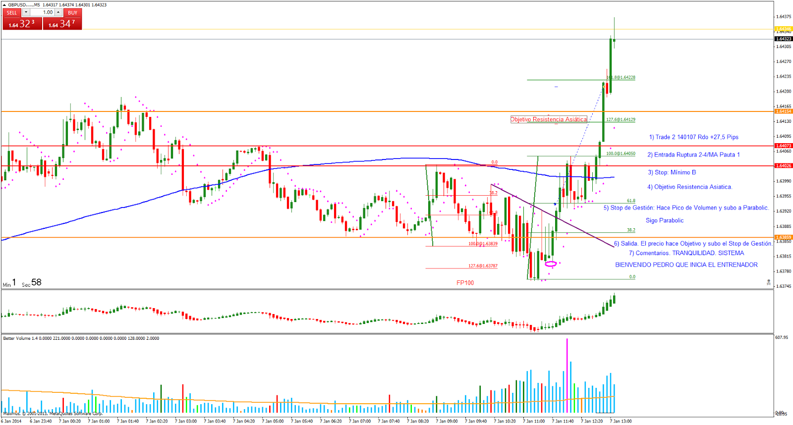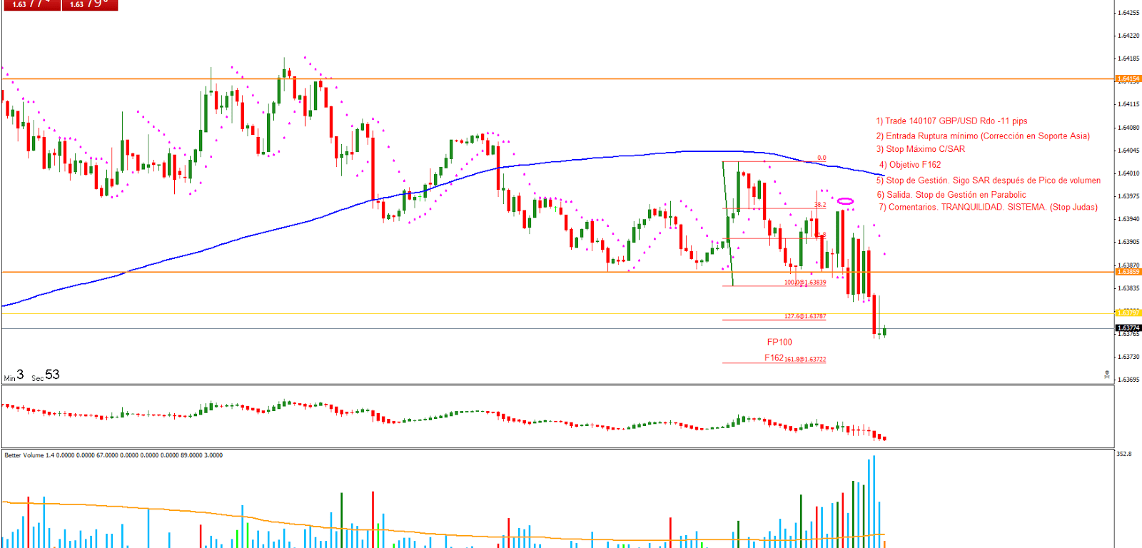 Trade 2 140701: Entrada ruptura línea 2-4 y Módulo de Arranque P1. Entro al mercado buscando el primer impulso alcista y con un objetivo en la resistencia del rango asiático. Hace el impulso antes de llegar al objetivo y subo Stop de Gestión al parabolic después del pico de volumen. Subo objetivo al F162 del nuevo impulso donde me saca del mercado con Rdo de +27,5 Pips.