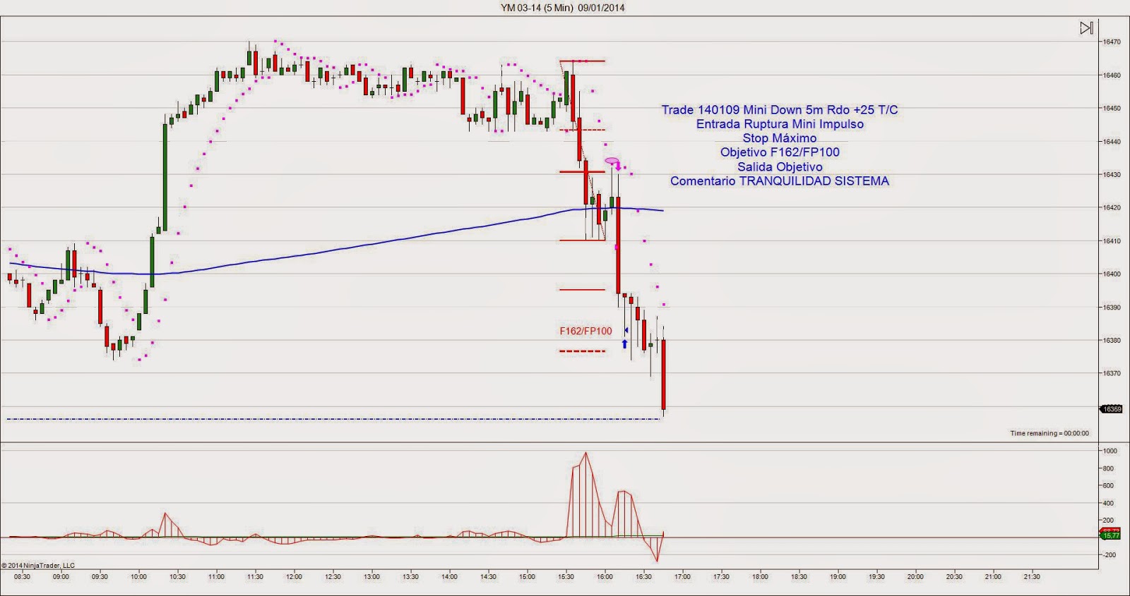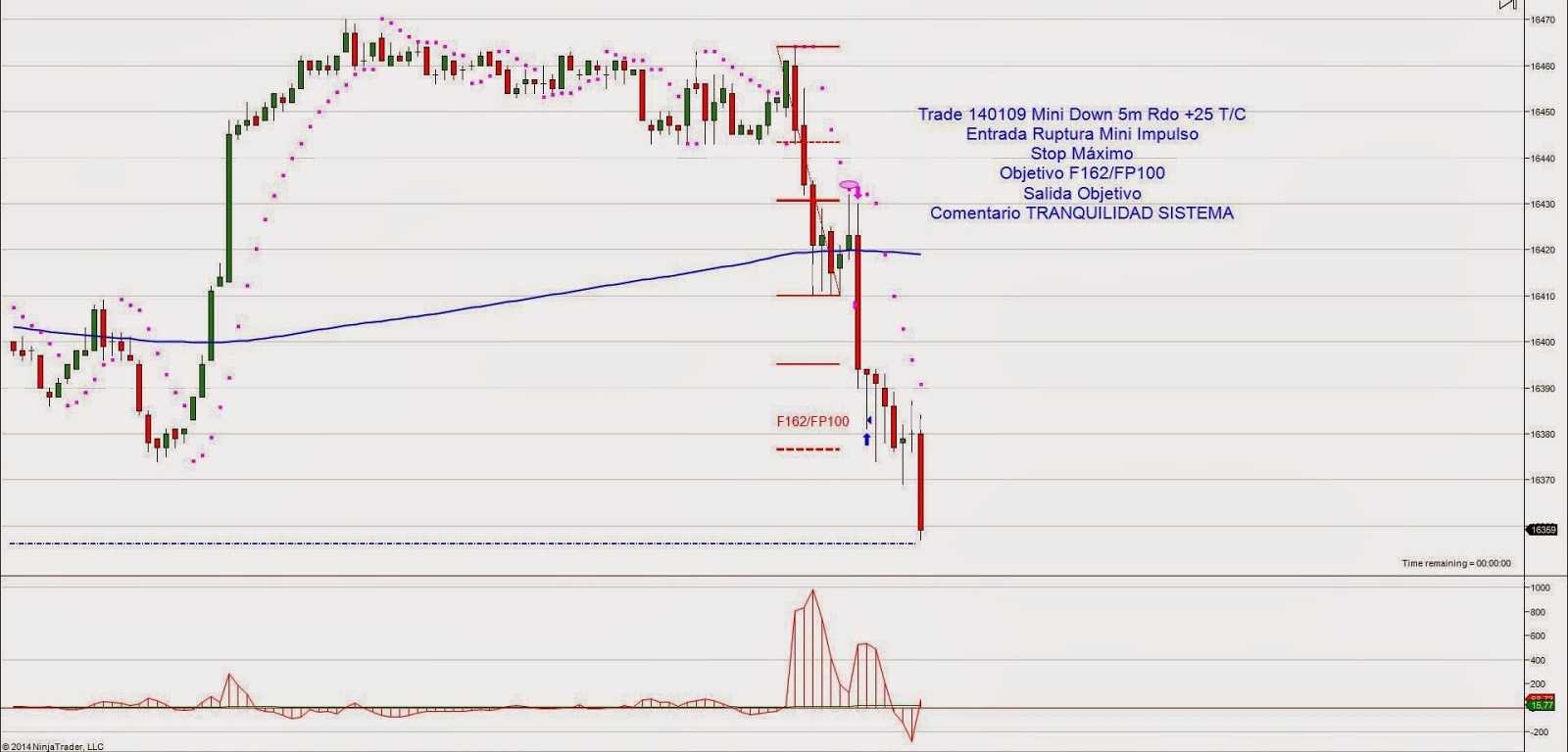 Trade 130109: Entrada Ruptura Mínimo del Impulso. Después de un primer movimiento corto el precio hace la corrección y entro en la ruptura buscando el segundo impulso. Salgo en el objetivo F162/FP100 con Rdo +20 pips netos en CFDs y +25 t/c en el futuro.
