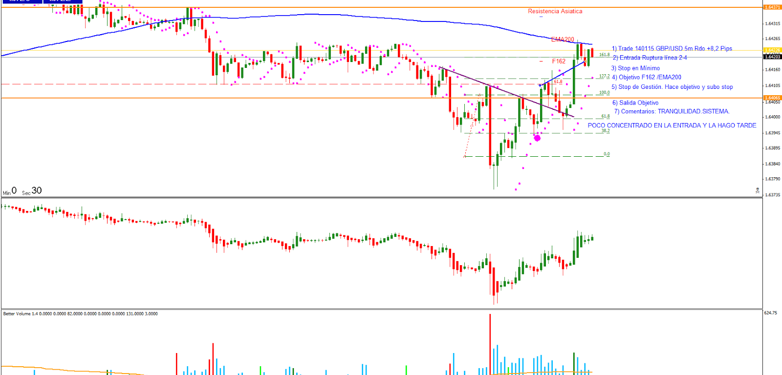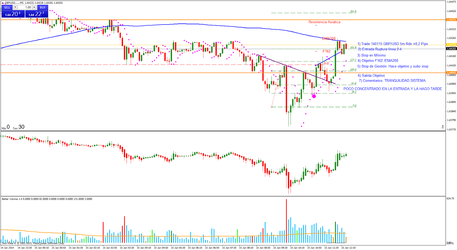 Trade 140715: Entrada ruptura línea 2-4. Entro al mercado en la ruptura de la línea buscando el F162/EMA200. Subo stop de gestión a F162 cuando hace pico de volumen. Salida en objetivo con Rdo +8,2 pips. Me despisto en la entrada y entro un poco tarde.