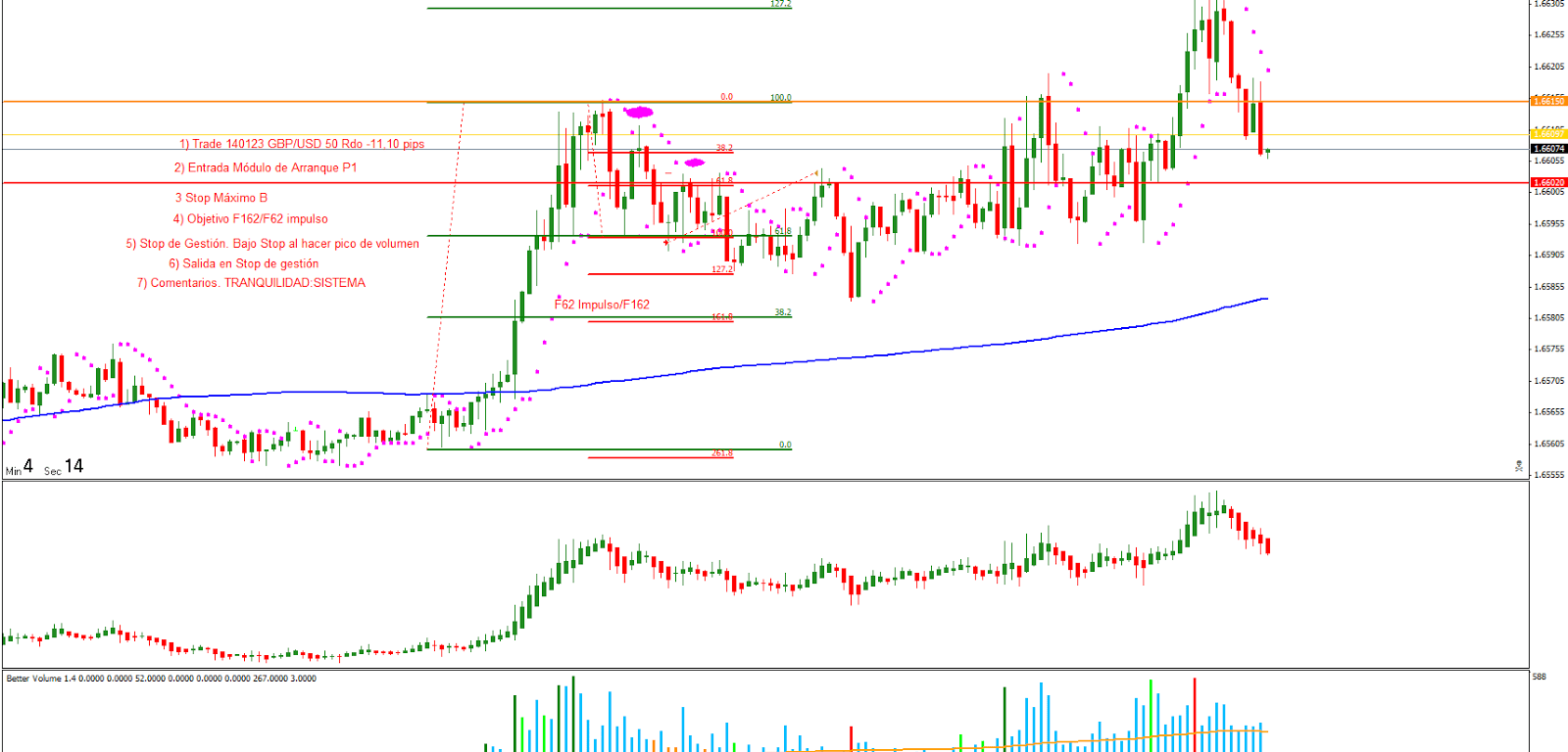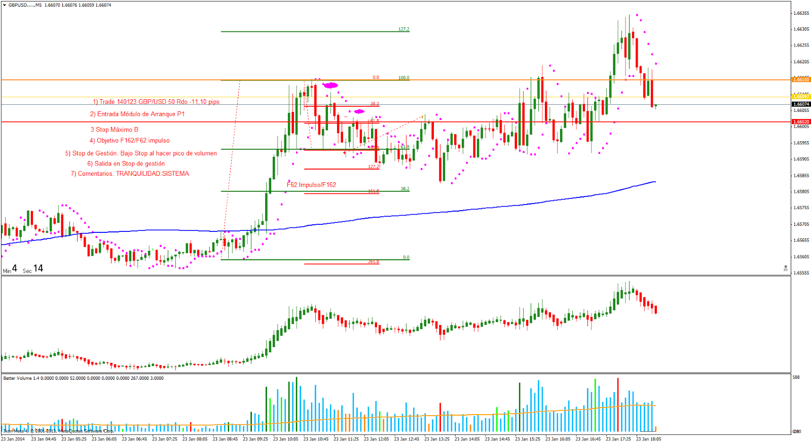 Trade 2 140123: Entrada Módulo de Arranque Pauta 1. El precio inicia la sesión europea con un impulso largo testeando la resistencia asiática que no rompe. Busco el Módulo de arranque y me poco corto con el stop por encima del máximo de la B. Pico de volumen y bajo el stop de gestión donde después en un trade bastante largo me salta el stop con Rdo -11,1 pips.