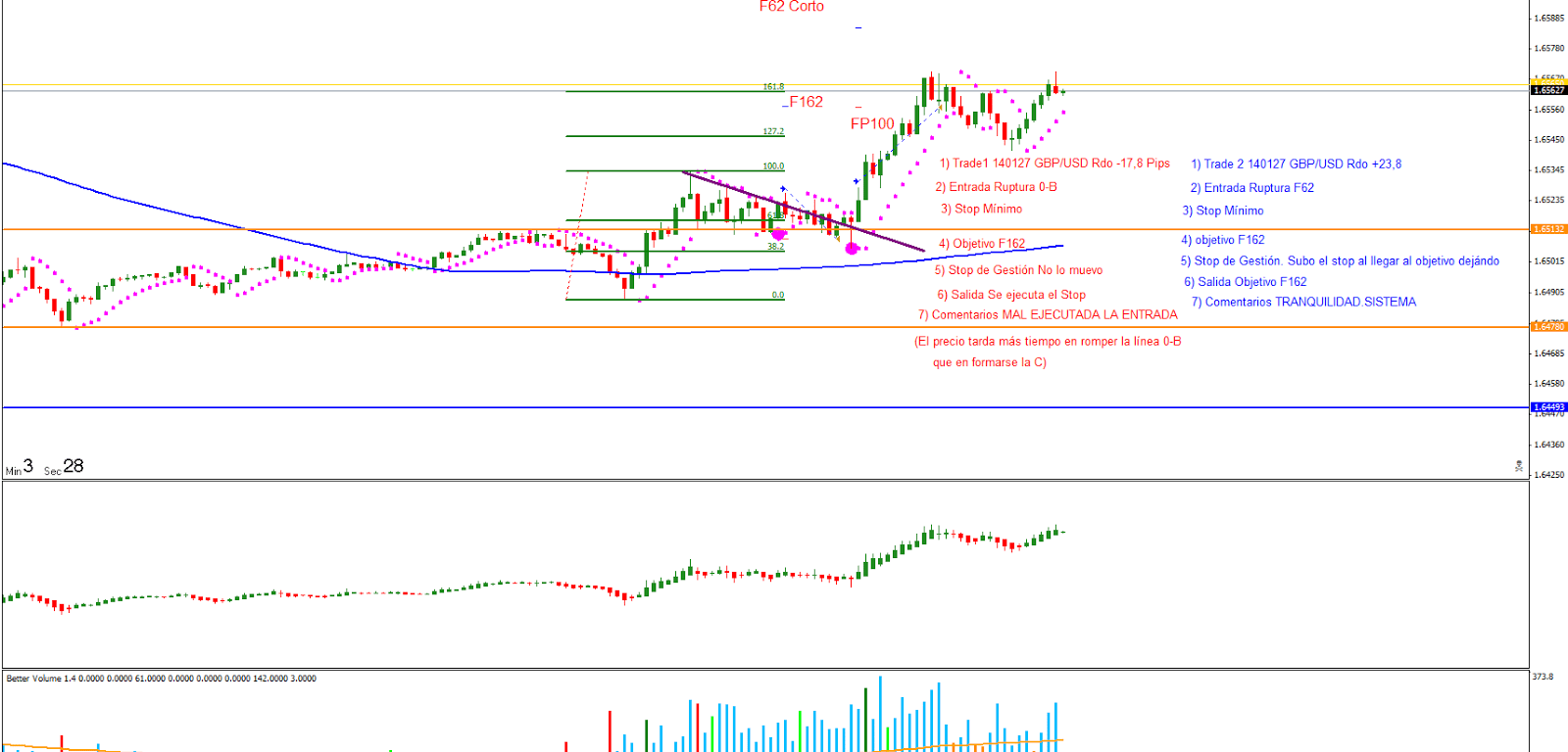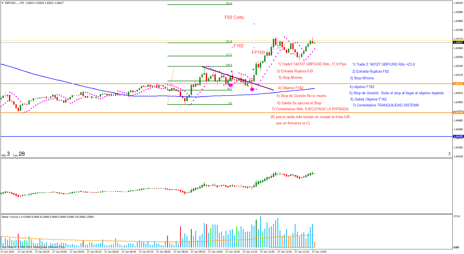 Trade 2 140127: Entrada Ruptura F62. Pauta plana y entro al mercado en la Ruptura del F62 de la corrección buscando el F162 del nuevo impulso. Llega al objetvio y subo el stop de gestión esperando posible escape hace el F62 del movimiento corto. Finalmente me saca en el objetivo con un Rdo -23,8 pips.