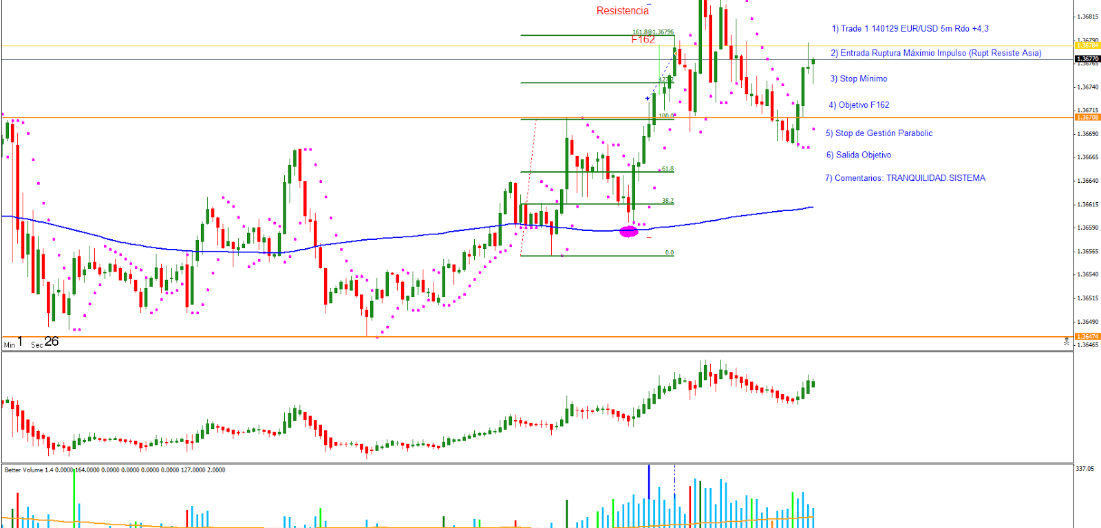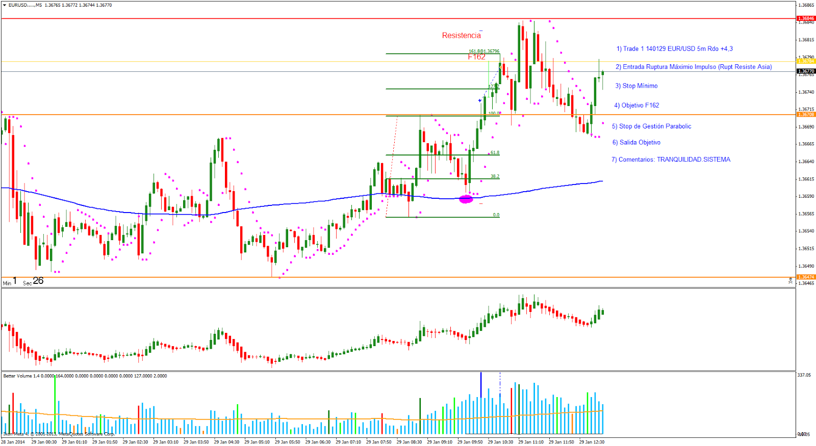 Trade 1 140129: Entrada Ruptura máximo del impulso. Mi objetivo es el F162 del impulso finalizado con opciones de llegar a la resistencia. Al hacer F162 suboi stop de gestión donde finalmente me salgo con Rdo +4,3 Pips.