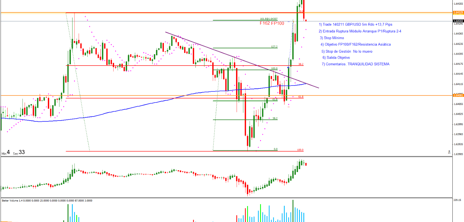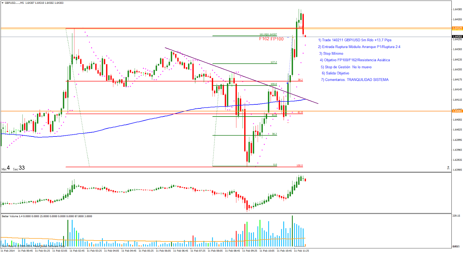 Trade 140211: Entrada Módulo de Arranque P1/Ruptura línea 2-4. Busco el origen del movimiento donde confluyen F162/FP100/Resistencia Asiática. Trade limpio y salida en objetivo con Rdo +13,7 pips.