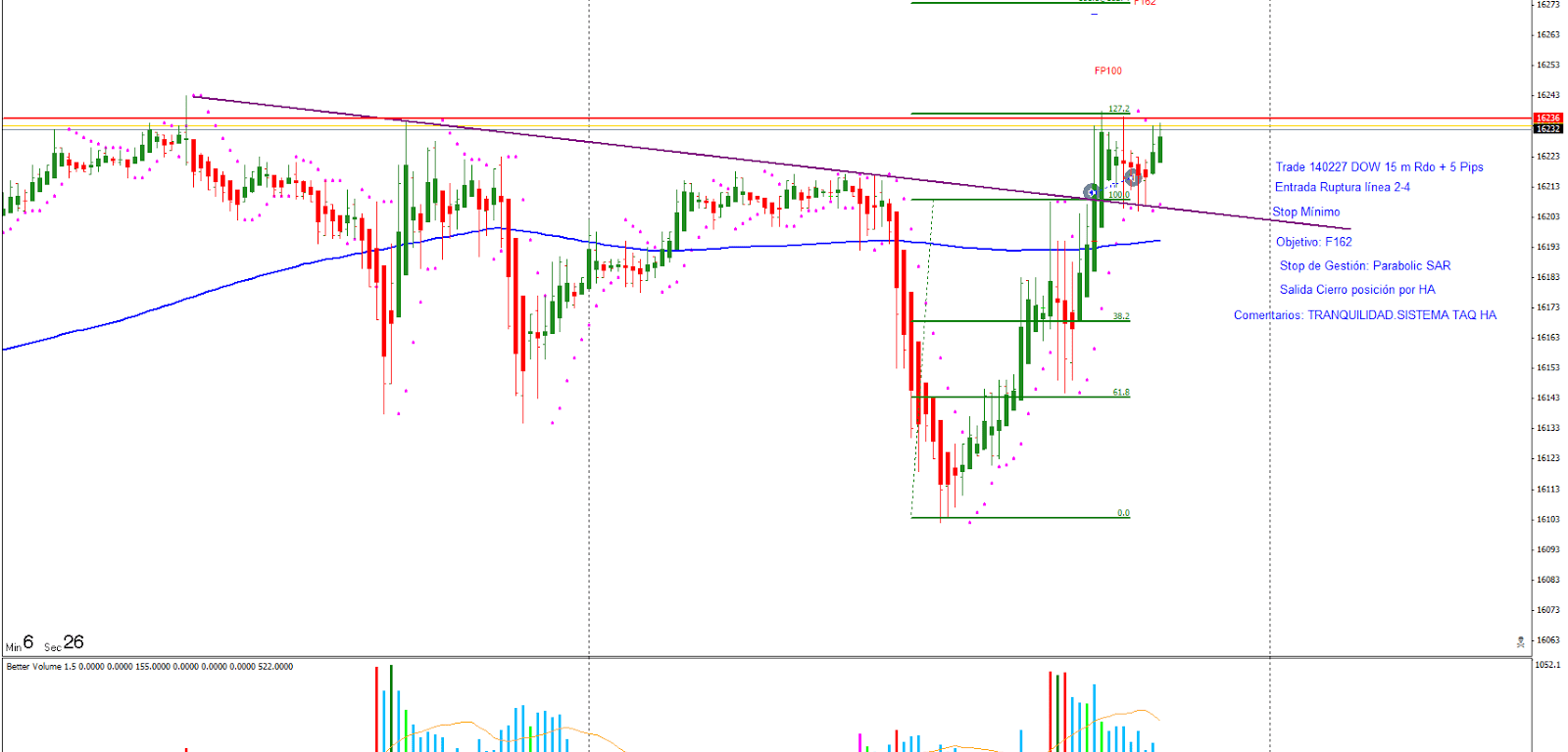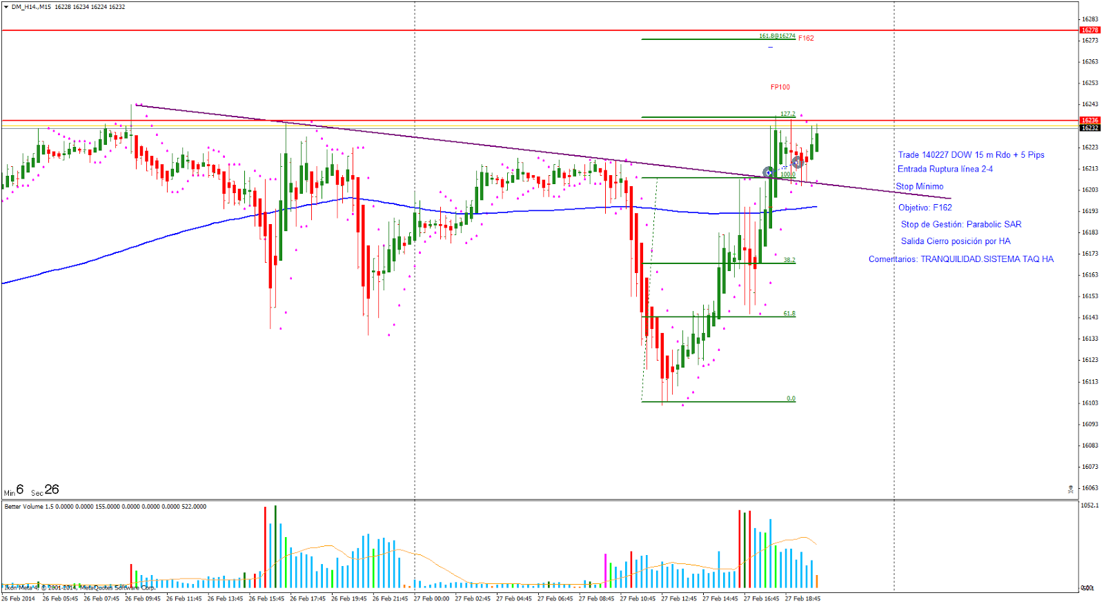Trade 14027: Entrada Ruptura línea 2-4. El precio ha realizado el primer impulso y espero a la corrección. Entro al mercado con objetivo seguir HA y Parabolic. Salida por HA con Rdo +5 pips.