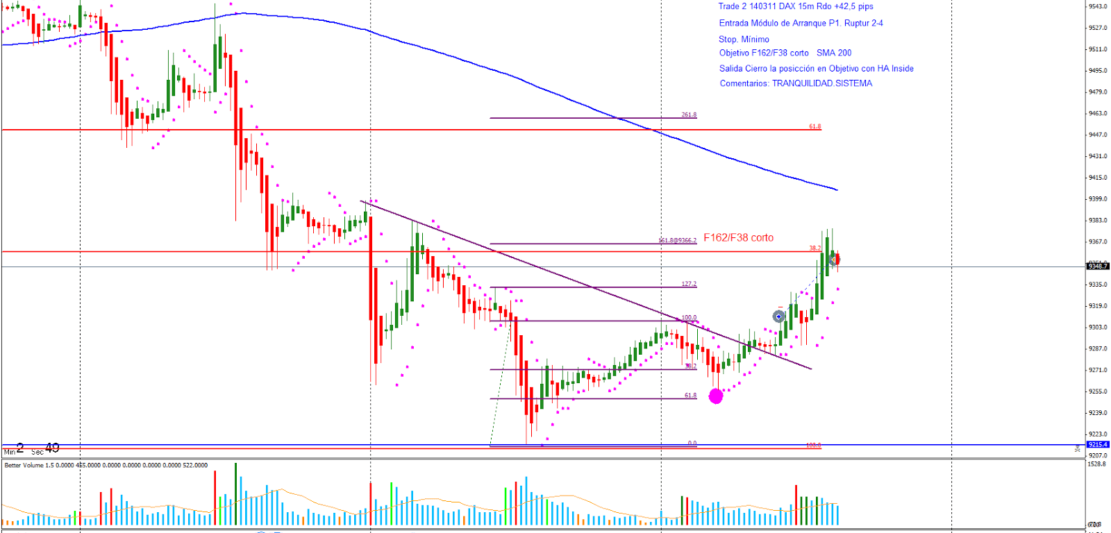 Trade 2 140311: Entrada Módulo de Arranque P1. El precio hace Módulo de Arranque y rompe la línea 2-4. Entro al mercado buscando el F162 del impulso anterior con confluencia con el F38 corto y el inicio de último movimiento corto. El precio llega a la zona de objetivos y la Heiken me dan la salida con un Rdo +42.5 pips.