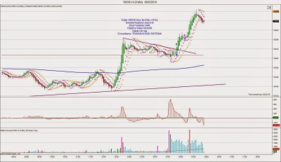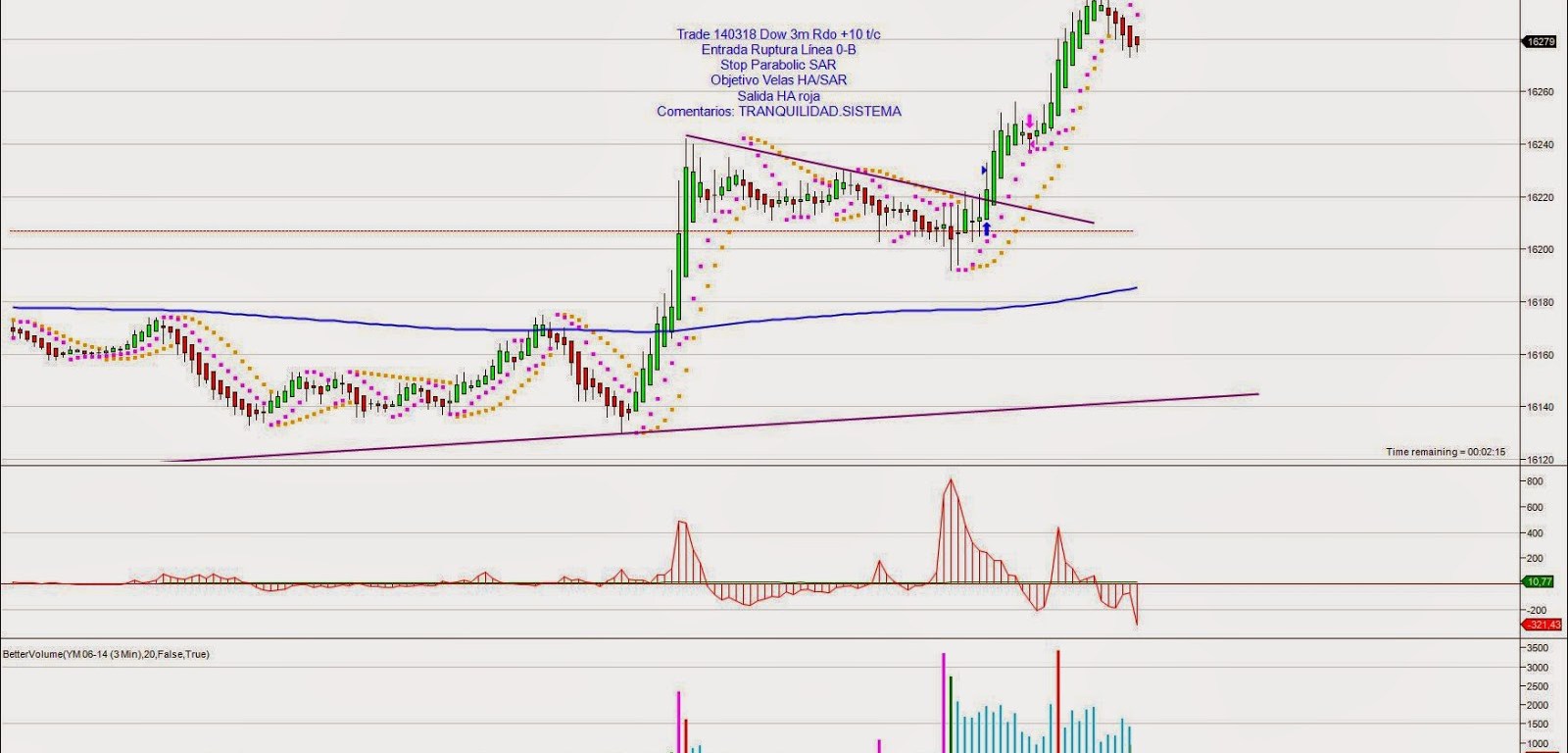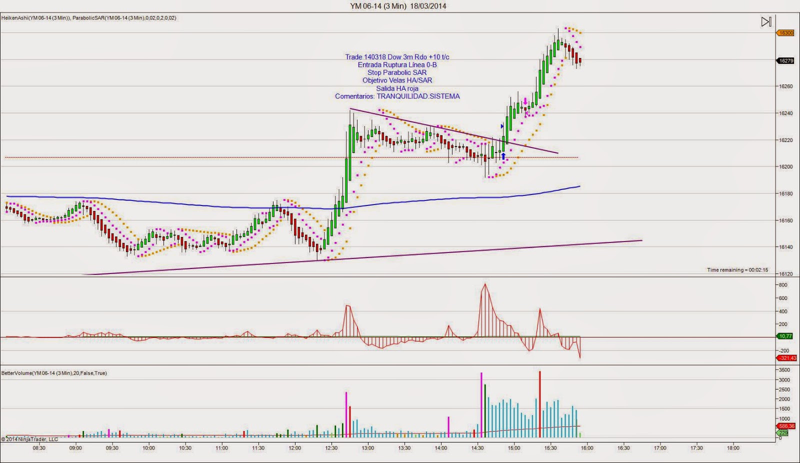 Trade 140318: Entrada Ruptura línea 0-B. Entro en la ruptura de la línea colocando el stop en el parabolic SAR. Mi objetivo seguir velas Heiken Ashi. Salida por HA con Rdo +10 ticks/contrato.