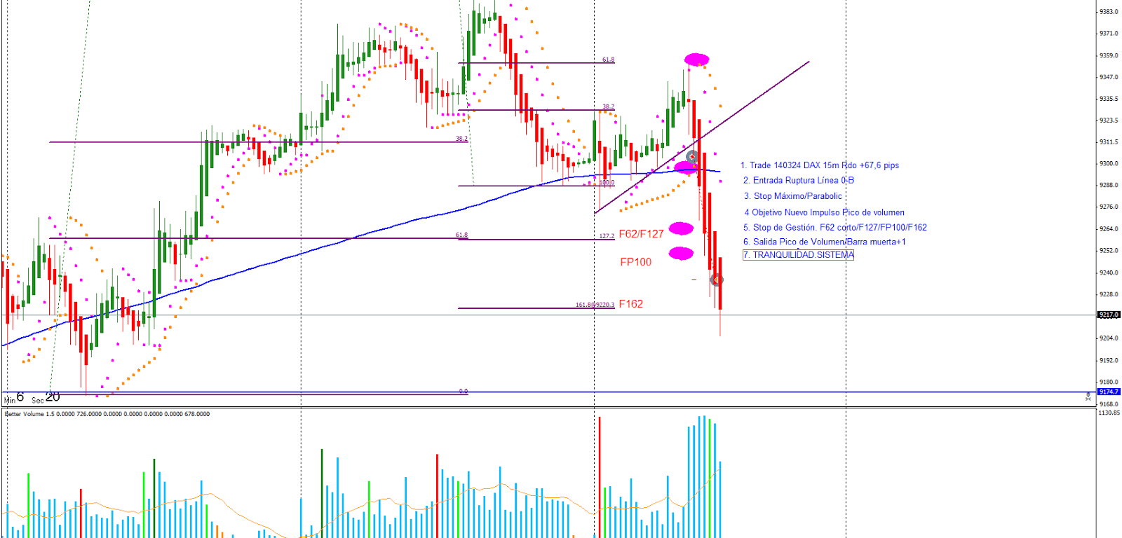 Trade 140324: Entrada Ruptura línea 2-4. Entro al mercado después de la corrección del primer impulso corto. Mi objetivo es buscar un nuevo impulso por lo que estoy atento al pico de volumen. Muevo el stop de gestión bajándolo a los fibos de referencia y en zona de F162 ajusto el stop después de barra muerta +1 donde me saca del mercado con un Rdo +67,5 pips.