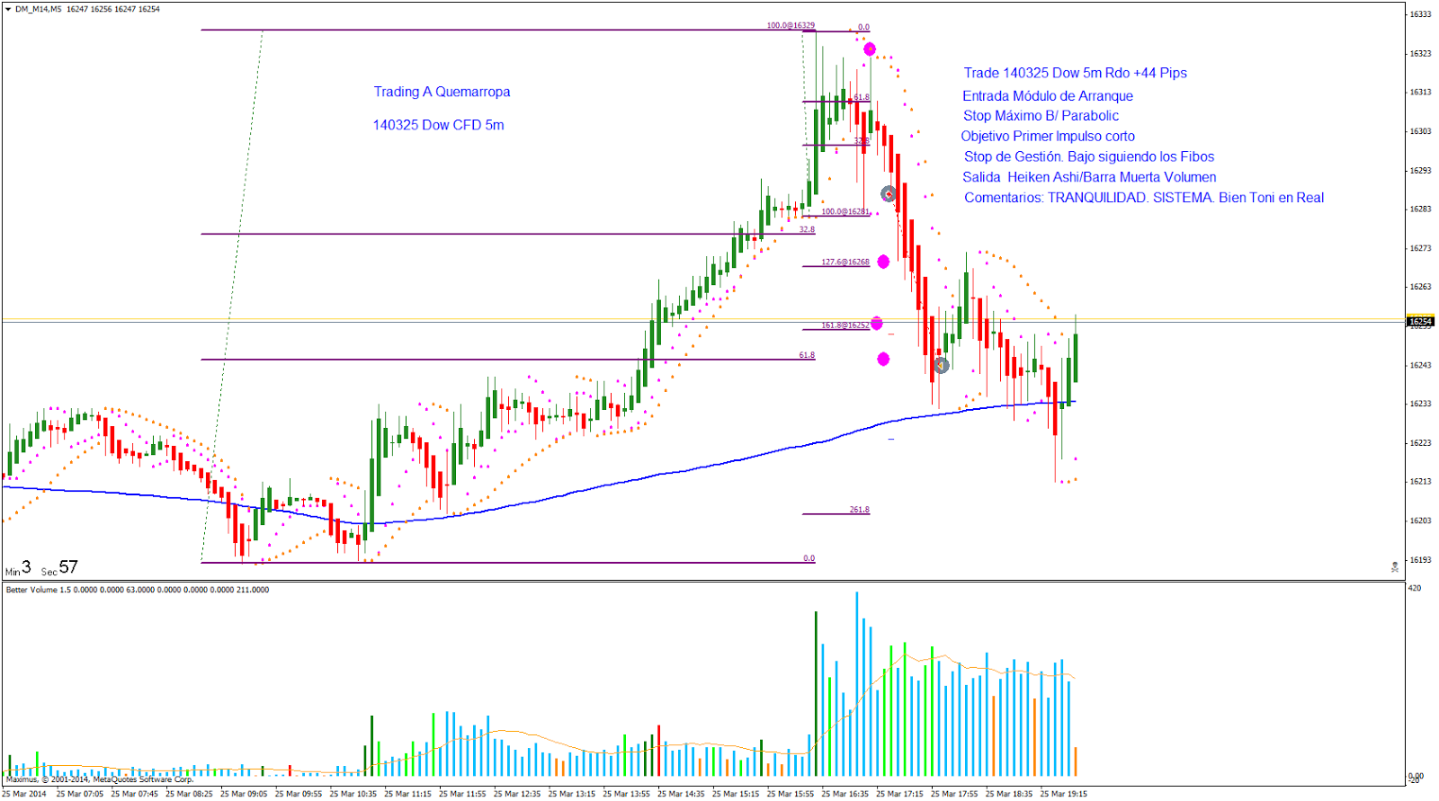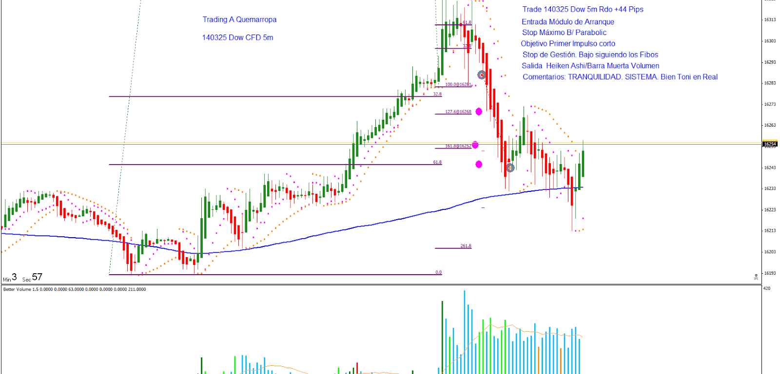 Trade 140325: Entrada Módulo de Arranque con HA. Entro al mercado buscando el primer impulso corto. Voy bajando el Stops de gestión a los Fibos. Salida después de pico de volumen y en zona de objetivos con Rdo +44 Pips.