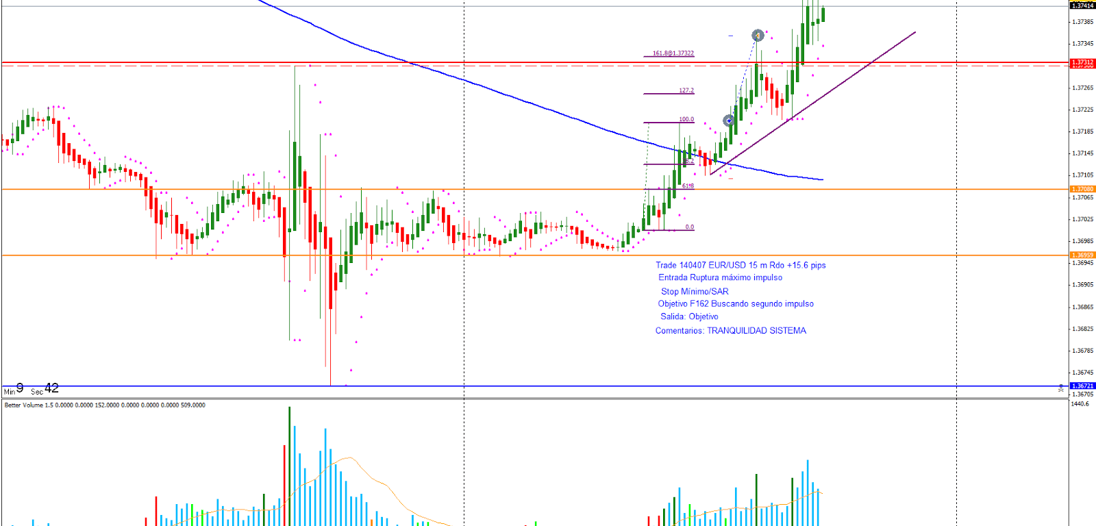 Trade 140407 Entrada Ruptura máximo del impulso. El precio ha hecho unprimer impulso y entro almercado buscando el segundo impulso. Objetivo F162 del primer impulso donde me salgo con Rdo +15.6 pips. Bien la Gestión Monetaria.