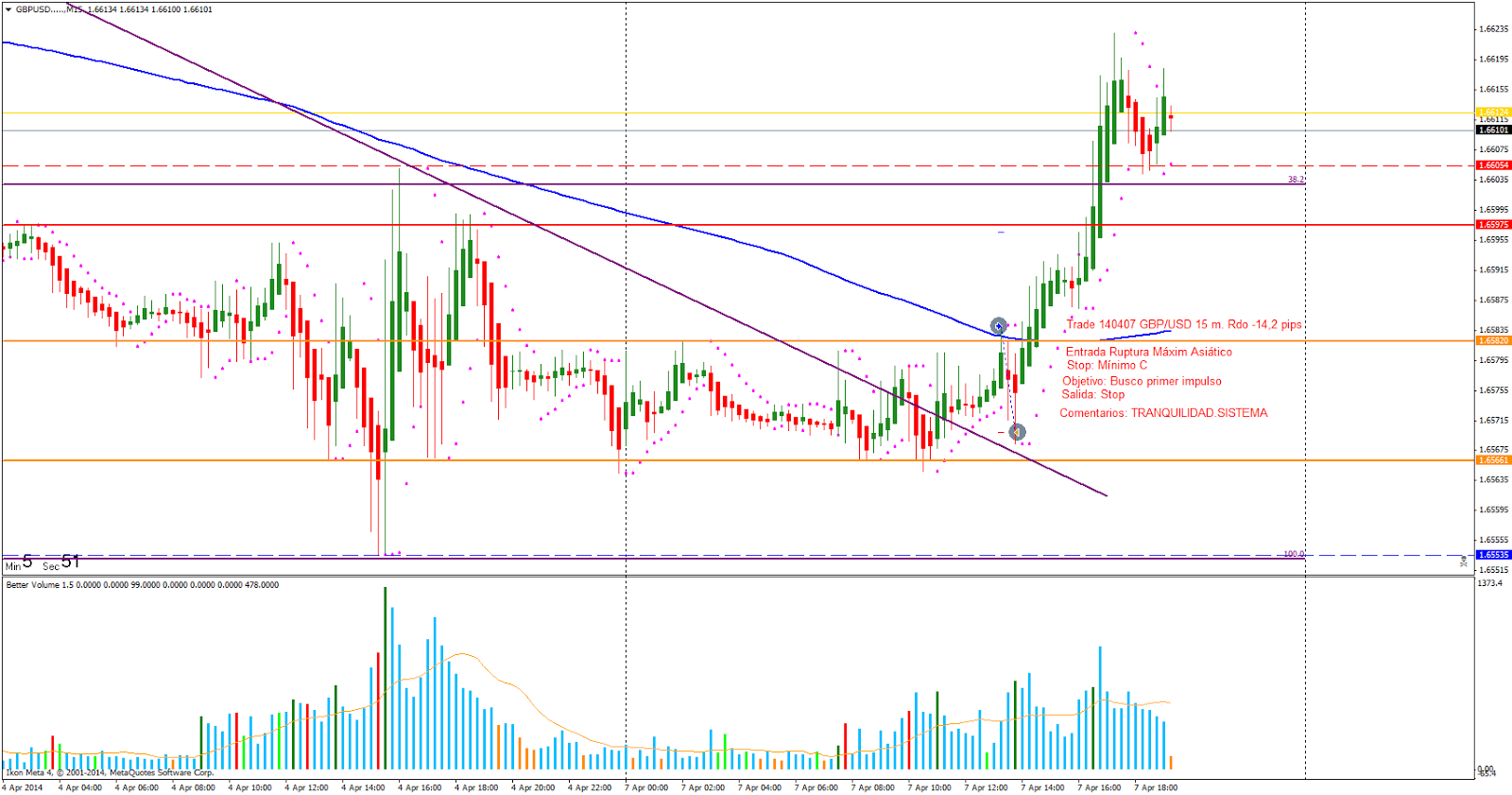 Trade 140407 Entrada ruptura rango asiático. El precio rompe el rango y entro al mercado con objetivo pico de volumen del primer impulso. Hace el retroceso y me salta el Stop (Stop Judas) con Rdo -14,2 pips.