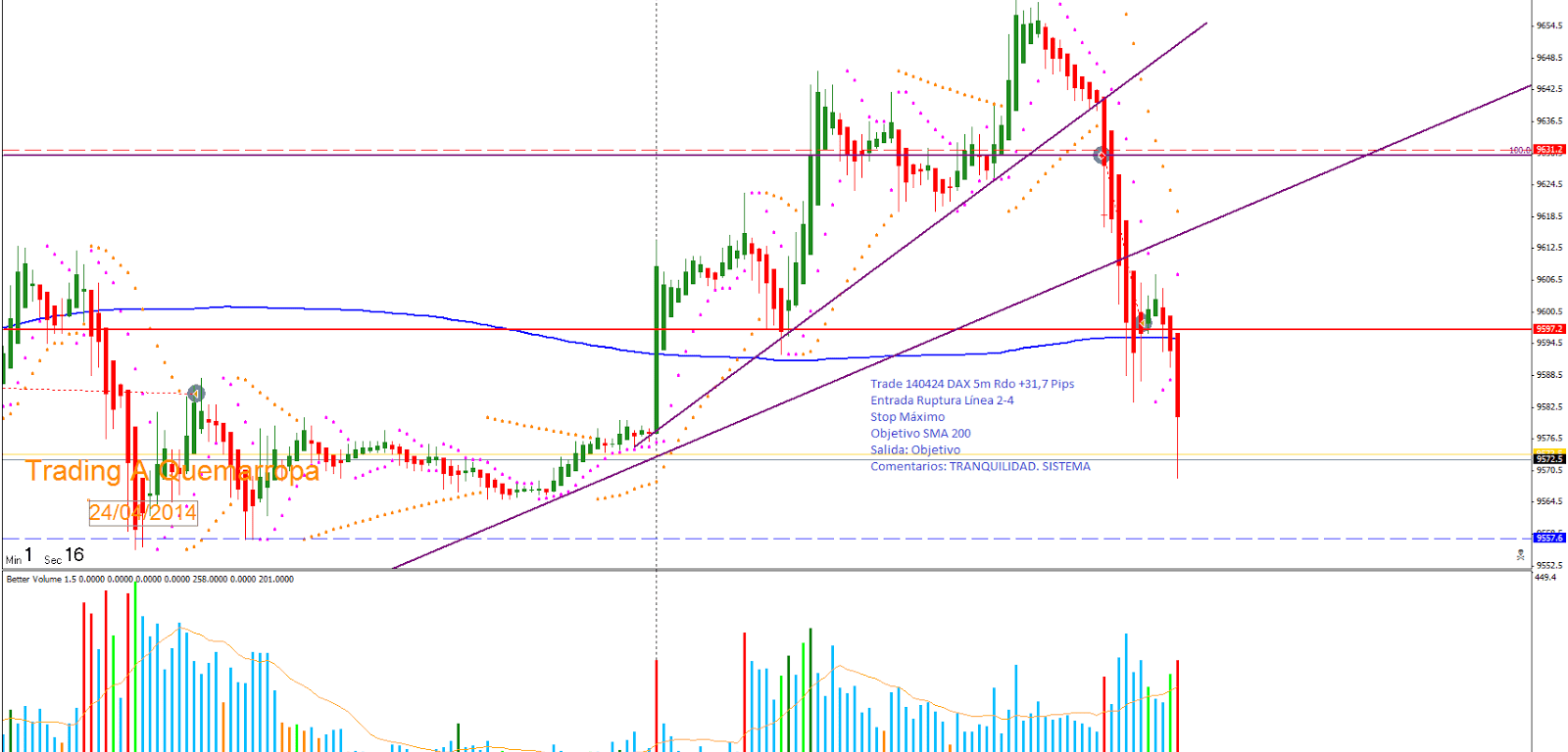 Trade 140424 Entrada Ruptura Línea 2-4: Entro al mercado en gráfico de 5m buscando el segmento A y con objetivo SMA200. Salida en objetivo con Rdo +31,7 pips.