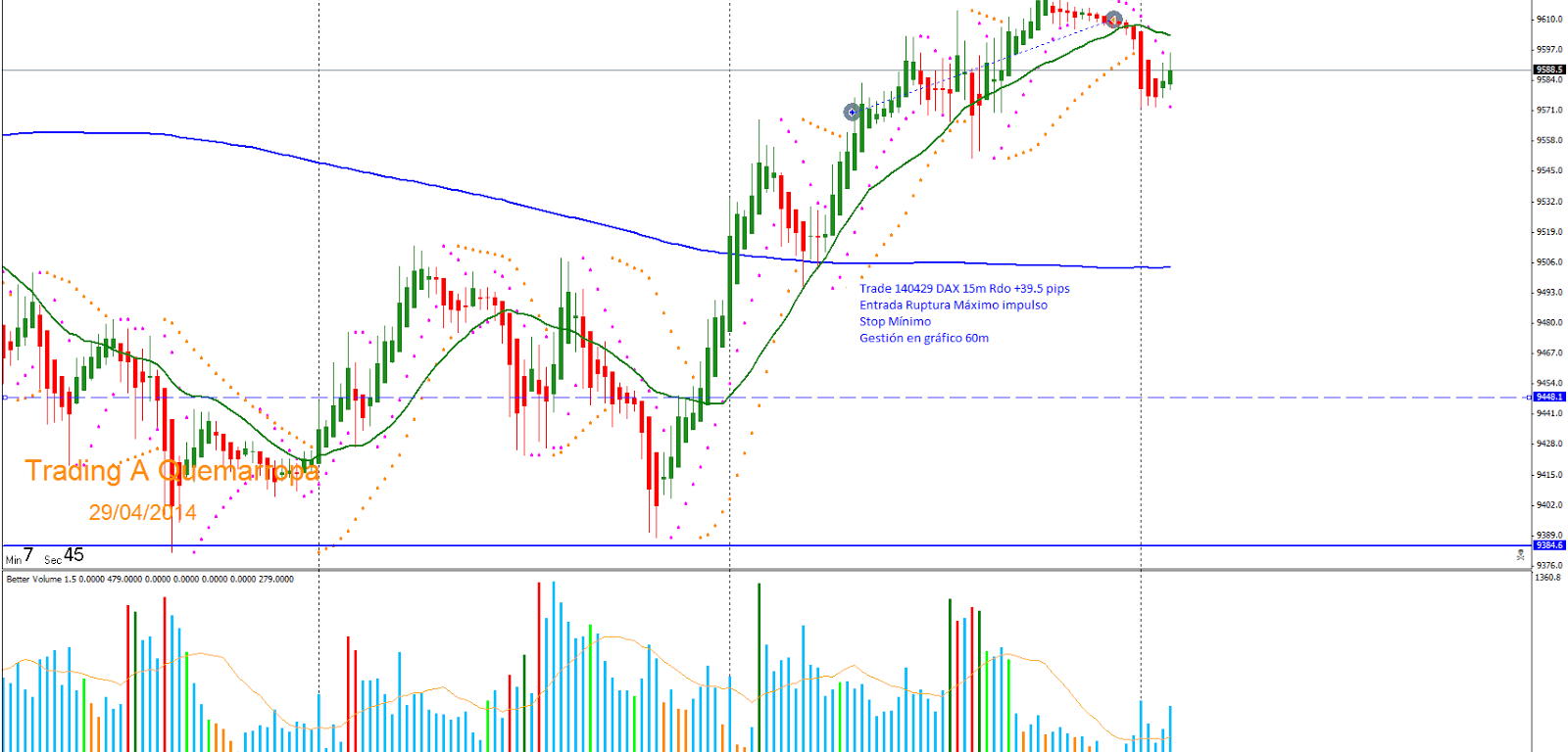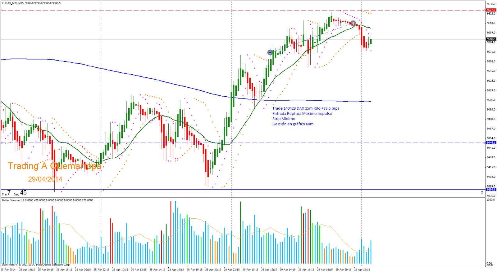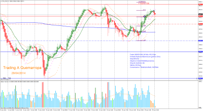 Trade 140429: Entrada Ruptura Máximo: Entro al mercado buscando el segundo impulso con objetivo F162/FP100. Gestiono el trade en el gráfico de 60m. Salida por HA con Rdo +39,5 pips.