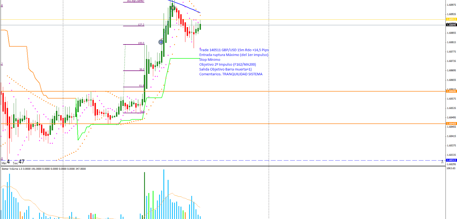 Trade 140512 Entrada Ruptura máximo del primer impulso. Entro al mercado buscando el segundo impulso, el objetivo en F162/SMA200/F62 corto. Me salgo en zona de objetivo en barra muerta +1 del volumen con Rdo +-14,5 pips.