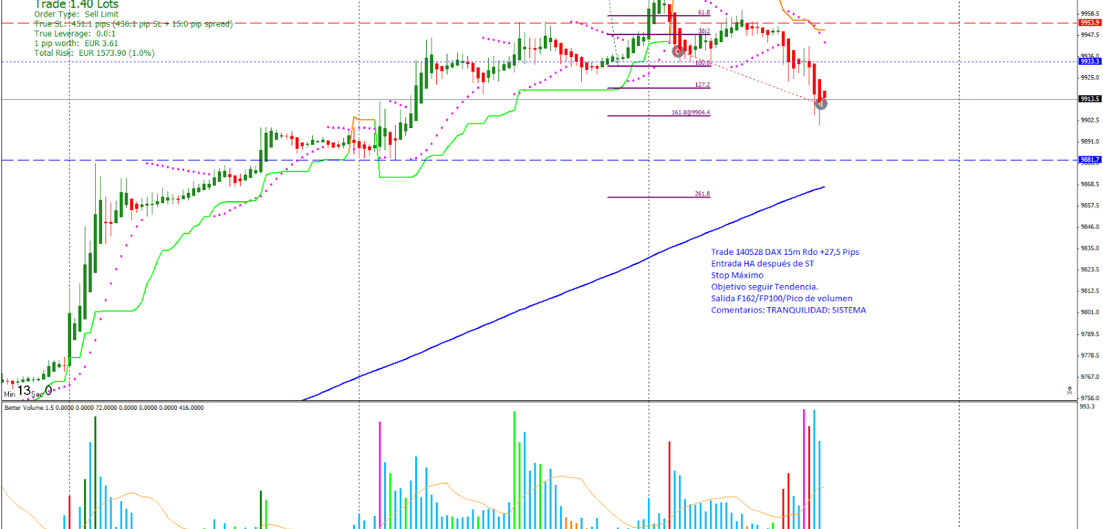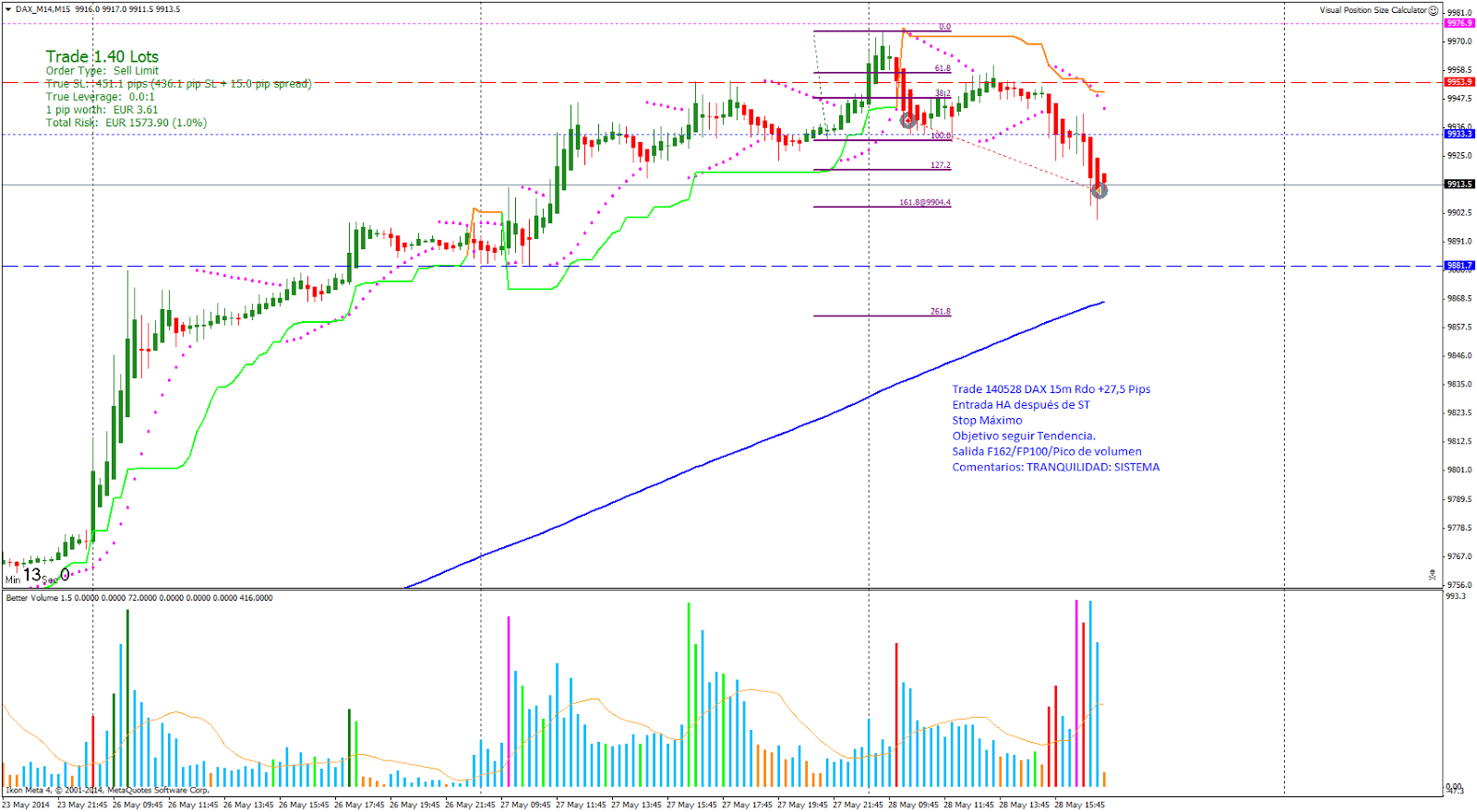 Trade 140528 Entrada Ruptura línea 2-4: Entro al mercado buscando seguir la tendencia con ST. Hace Pico de volumen en F162/FP100 y me salgo de la posición con Rdo +27,5 pips.