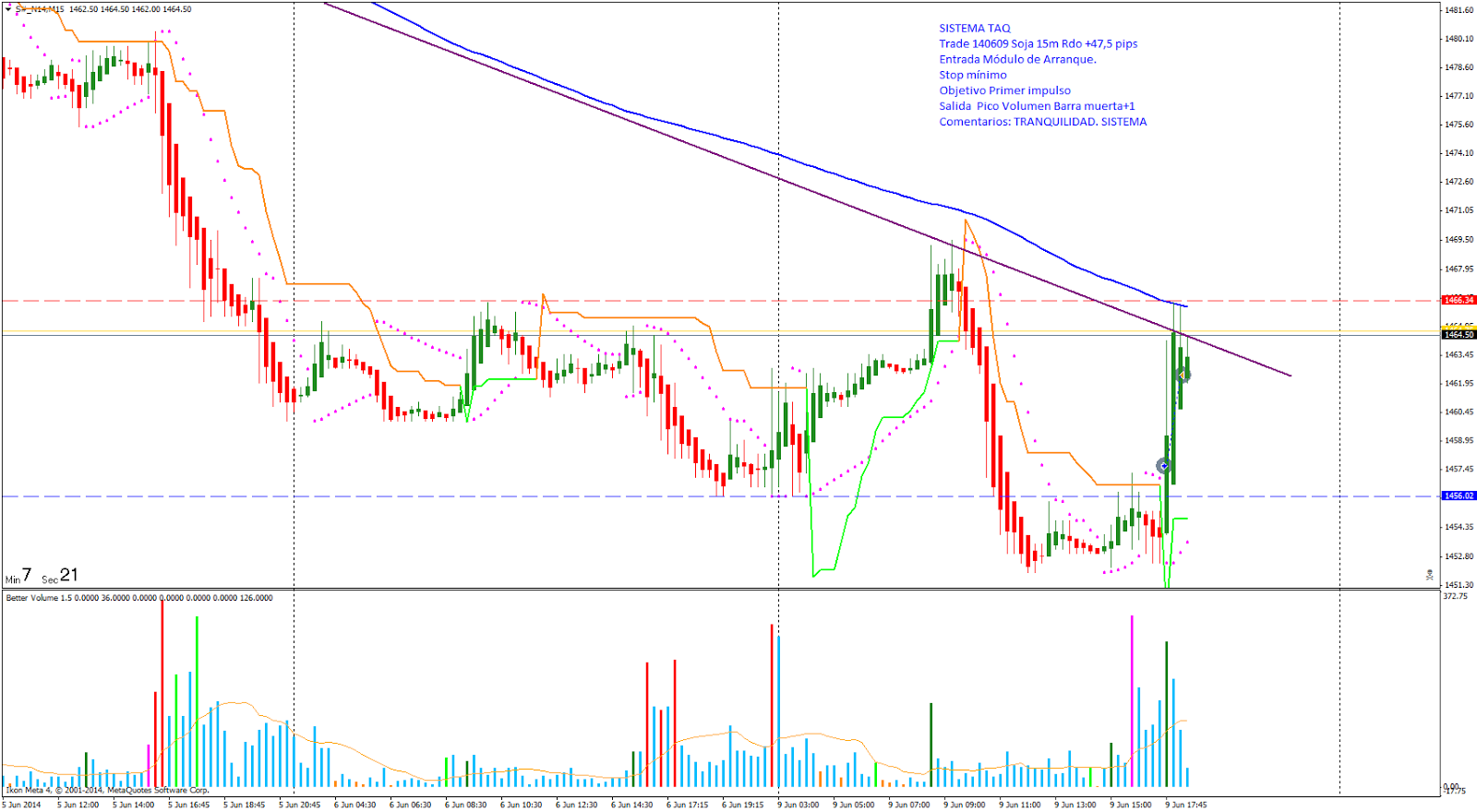 Trade 140609 Entrada módulo de arranque/ST. Entro al mercado buscando el primer impulso. Hace pico de volumen parándose en la SMA200/línea 2-4 y me salgo en barra muerta +1 del pico de volumen con un Rdo +47,5 pips.