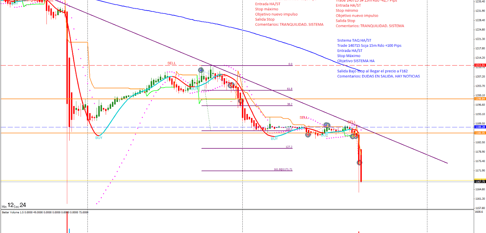 Trade 140715 Entrada TAQ HA_S#. Entro al mercado con la intención de seguir la tendencia. Coloco stop en el ST, el precio finalmente rompe y las HA me dan señal de giro. Dudo en la salida porque hay noticias. Decido bajar el Stop de gestión y protegerme después que el precio llegue al F162. Fuera de mercado con Rdo +100 pips.