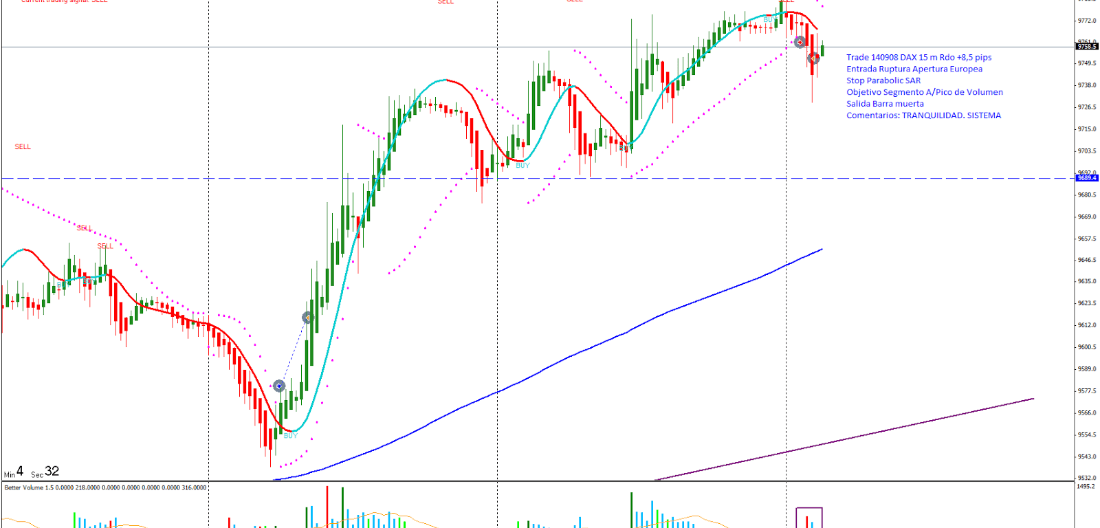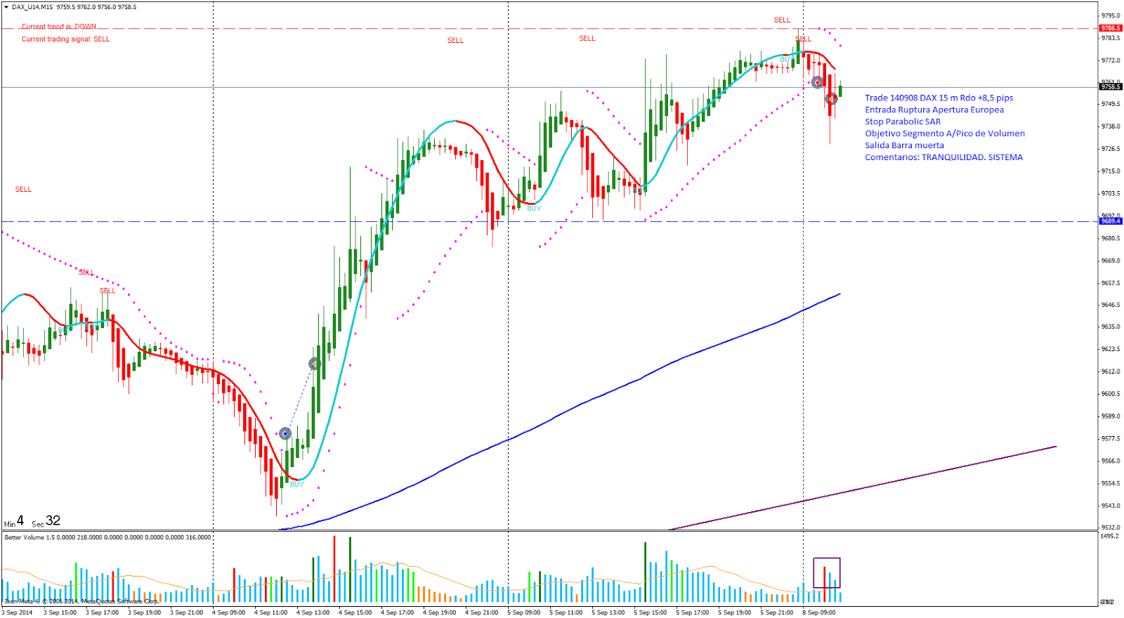 Trade 140908 Entrada Ruptura en Apertura europea. Entro al mercado buscando el segmento A, Climax de ventas en el volumen y me salgo en barra muerta del pico de volumen con un Rdo de +8,5 pips.