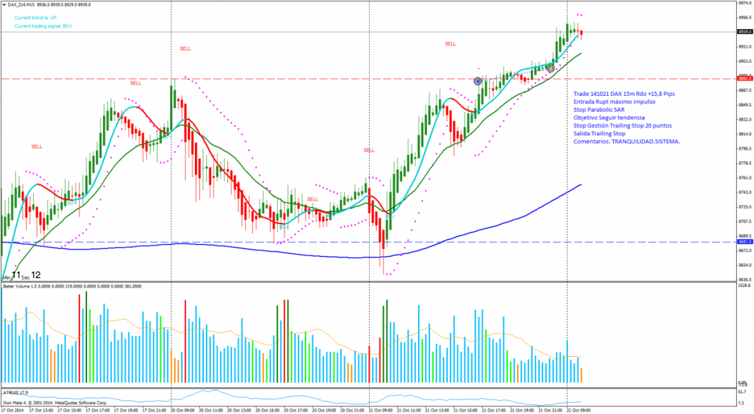 Trade 141021: Entrada Ruptura Máximo del impulso. Busco segundo impulso, se va acercando la hora del cierre y ajusto trailing stop, no quiero dejar posición abierta por la noche. Salida trailing stop con un Rdo de +15,8 pips.