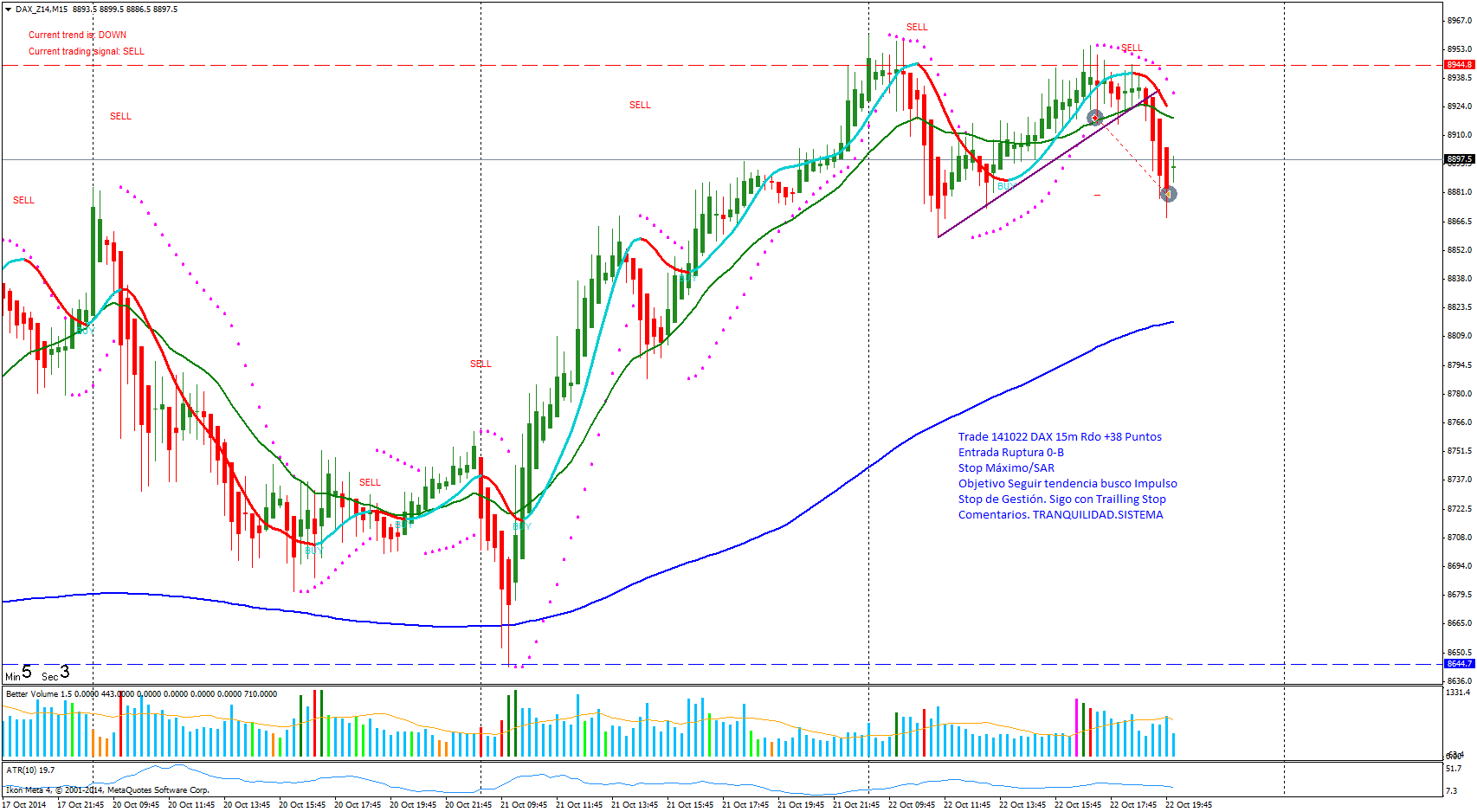 Trade 141022: Entrada Ruptura línea 0-B. El volumen hace que me precipiete en la entrada, después gestiono el trade y coloco traillin stop cuando el precio ya me da la razón. Salida trailing stop con un Rdo de +38 pips.