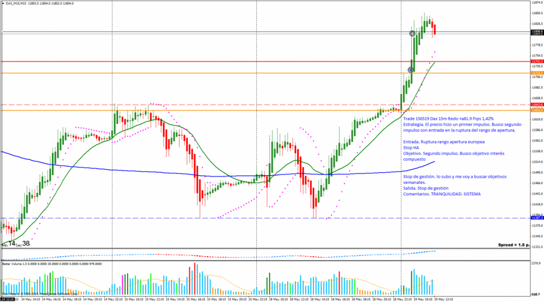 Trade 150519: Entrada Ruptura Apertura Londres. El precio rompe el máximo del rango de apertura, busco segundo impulso, voy subiendo Stop de gestión superando objetivos de interés compuesto. Salida con objetivo semanal. TRANQUILIDAD Y SISTEMA.