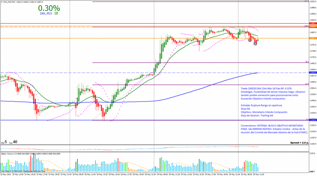 Estrategia: El precio ha realizado dos impulsos largo. Si rompe el rango de apertura buscaré objetivo monetario. Hoy Estados Unidos – Actas de la reunión del Comité de Mercado Abierto de la Fed (FOMC) por lo que seguramente será complicado operar.