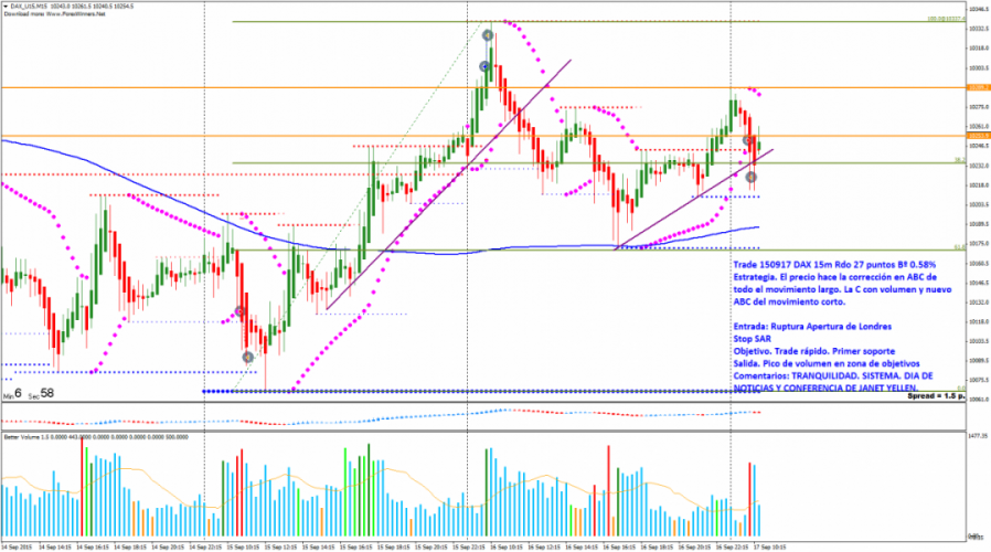 Entrada: Ruptura Mínimo rango de apertura. Dia de muchas noticias y de conferencias de Janet Yellen. Busco trade rápido y hasta el lunes. Cierro posición en pico de volumen con Rdo +27 puntos y Bº 0.58%.