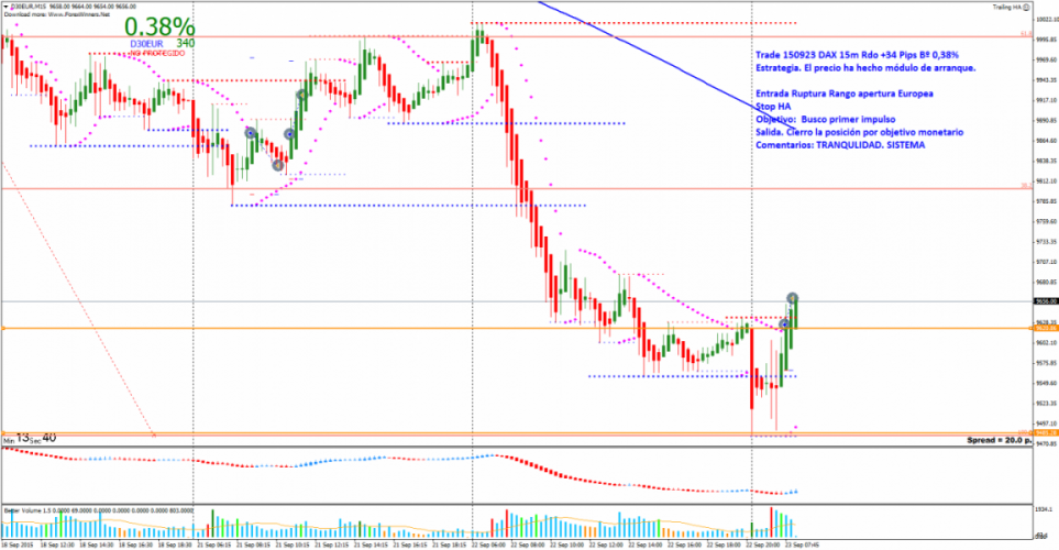 Trade 150923: Entrada Ruptura máximo rango apertura europeo. Entro al mercado con idea de seguir las HA y buscar el primer impulso. El volumen no me da garantías y me salgo del mercado con Rdo 34 pips y un Bª 0.38%.