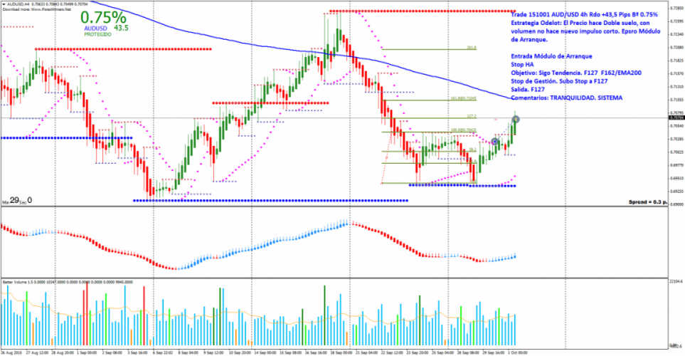 Trade: Entrada Módulo de Arranque. Busco el primer impulso largo con potenciales objetivos F127 y F162/EMA200. El precio sobrepasa el F127 y subo stops de Gestión al primer objetivo buscando el F162. Finalmente me saca en F127 con Rdo 43,5 Pips y un Bº 0,75%.