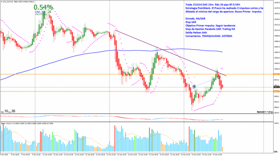Trade: Entrada HA/SAR. Busco inicio de la tendencia alcista. Coloco Stop en el mínimo y el stop de gestión en Trailing SAR, Protejo los beneficiso con Trailing HA. Salida por HA con Rdo +26 Pips y un Bº 0.54%.