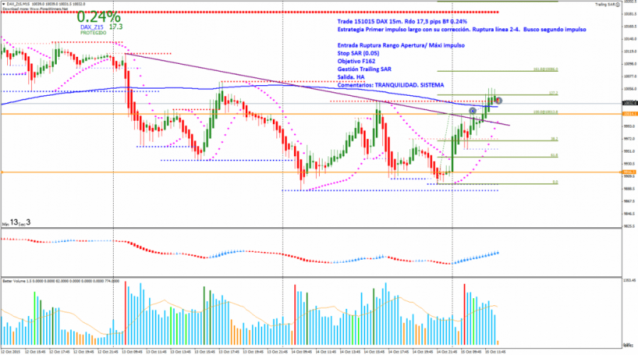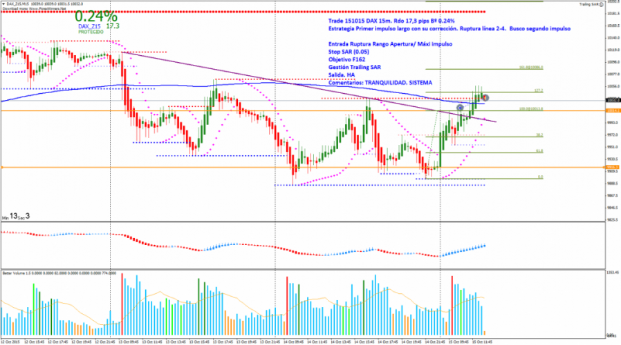 Trade: Entrada Ruptura rango asiático/ Máximo del impulso largo anterior. Busco segundo impulso. Coloco Stop en el SAR y protejo los beneficios con Trailing HA. Salida por HA con Rdo +17.3 Pips y un Bº 0.24%.
