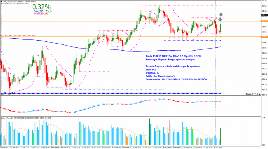 Trade: Entrada Ruptura rango del máximo del rango de apertura. Fuerte vela de apertura. No tengo muy claro la gestión y ante las dudas me salgo del mercado con el objetivo monetario. Rdo 15.5 Pips y un Bº 0.32%