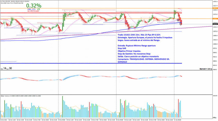 Trade: Entrada Ruptura rango del mínimo de la apertura europea. Entro al mercado buscando el primer impulso. Salida en barra muerta +1 (BM+1) y objetivo monetario. Rdo 23 Pips y un Bº 0.32%.