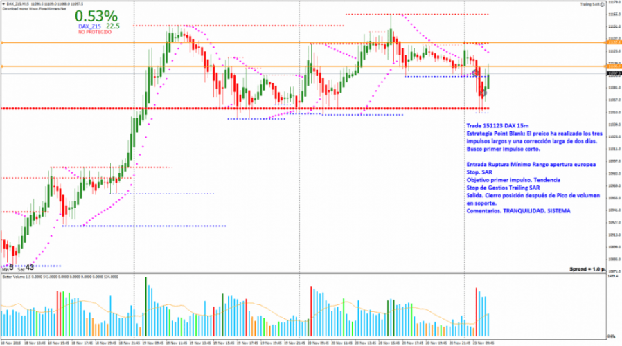 Entrada: Ruptura Mínimo del rango de apertura. Busco tendencia, el precio toca soporte haciendo pico de volumen donde confirma el primer impulso. Cierro posición con Rdo 22.5 pips y un Bº 0.53%.