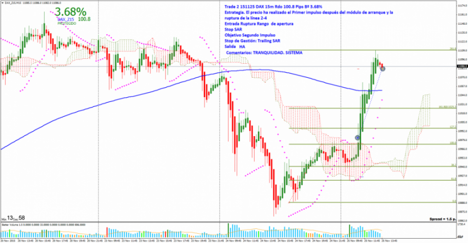 Entrada 2: Ruptura Rango Máximo de apertura. En esta segunda entrada busco la tendencia y sigo el Stop de Gestión con el SAR. Salida Por HA con Rdo 100.8 Pips y un Bº 3.68%.