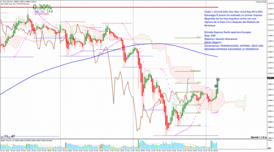 Entrada 1: Ruptura Máximo. Busco objetivo monetario y cierro posición con Rdo 14.8 pips y un Bº 0.30%.